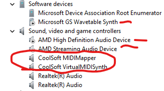 But if you can see that device manager picture, you'll see that in order to enable the Coolsoft Midi-mapper and a decent synthesizer, I had to disable everything else.